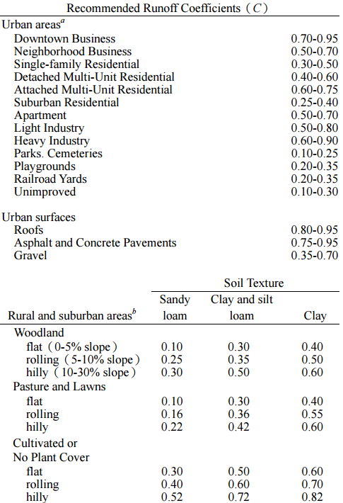 【已刪除】三、某一集水區域,面積約 4800 平方公尺,其中包含 1600 平方公尺硬鋪面(停車場及 車道),1600 平方公尺草地,1600 平方公尺樹林;此區平均坡度 11%,土質為黏 土(clay),此區最大降雨強度 13 cm/小時,下表為逕流係數對照表,請計算此區 尖峰地表逕流量(立方米/小時)。(20 分)