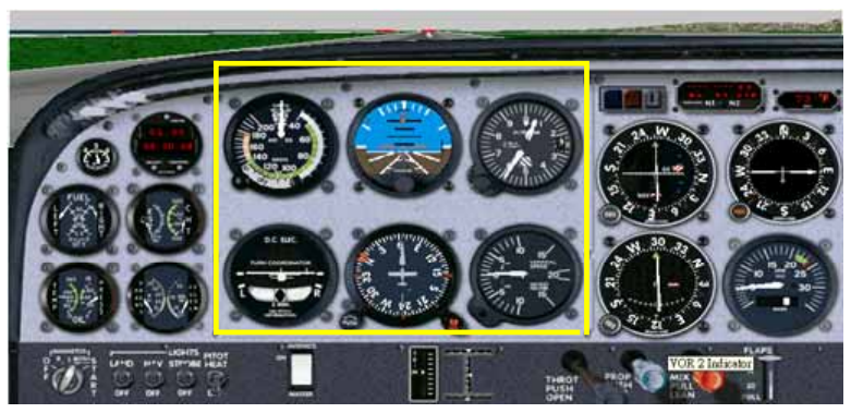 四、下圖是一個小型飛機的儀表板,請寫出本圖中央框選部分幾格儀表的名稱與功能, 並說明航電儀表的排列形式的特殊法則。(10 分)