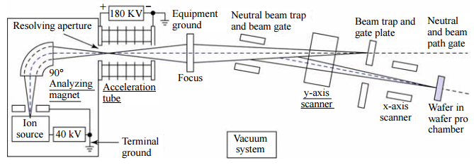 【已刪除】六、下圖是一個典型的離子佈植機的架構,請說明圖中 Analyzing magnet、Acceleration tube、y-axis scanner 的作用。(15 分)