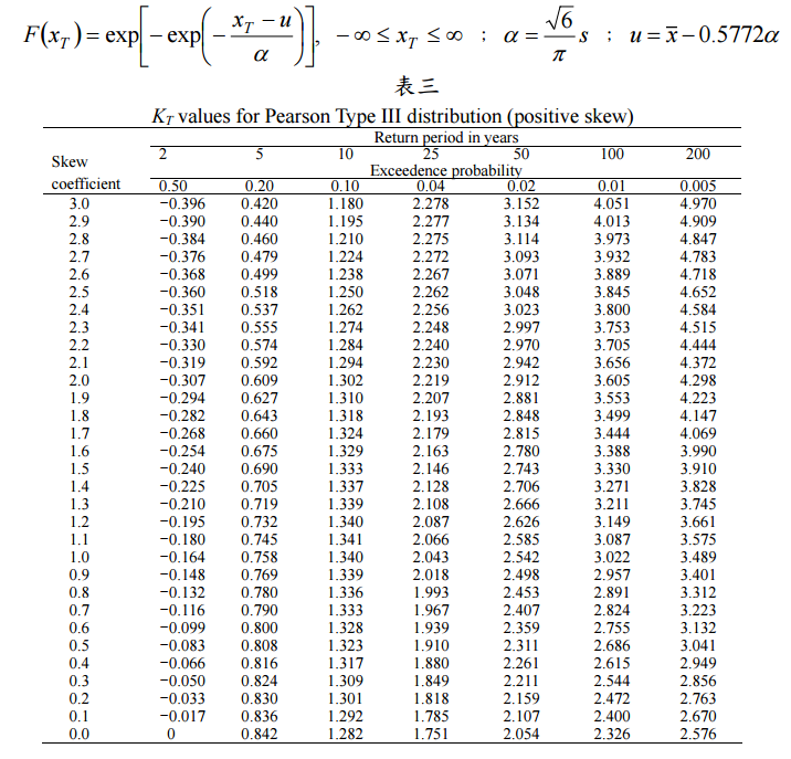 ⑶假設某一城市過去 35 年的年最大 10 分鐘降雨紀錄為常態分布(Normal distribution),且經頻率分析後得知 5 年及 50 年重現期距的最大 10 分鐘降雨量分 別為 0.78 吋與 1.21 吋,試求此資料之平均數(mean)與標準偏差(Standard deviation)。(5 分) 註:表三可供參考使用。