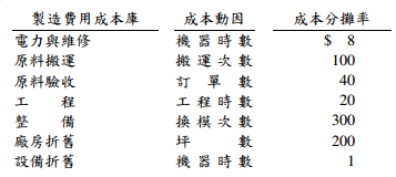 台南公司採用部門別製造費用分攤率,在裝配站A,直接製造費用僅包括領班的薪水 ($50,000)及設備折舊($40,000)。其他製造費用中,廠房折舊費用佔單位固定製造費用$12 中的$2,其餘$10乃由工廠的服務部門,按逐步分攤法分攤而來。最近有位外聘的顧間建 議公司採用作業基礎成本制度(Activity-Based Costing System),為了協助新制度的推行,他 建立下列資料: