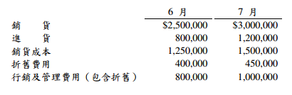 【已刪除】二.台中公司生產高級防曬油,公司正在編製7月份的現金預算,以免在營業旺季發生現 金週轉不靈的現象,其估計的資料如下: (1)估計7月1日的現金餘额為$100,000。 (2)公司商品採購皆以賒購方式,有50%的進貨於當月付清,其餘則於次月付清。 (3)公司客戶於購買產品當月份付清40%的帳款,餘额於次月付清,預計有2%的壞帳 (於銷售當月以備抵法認列於行銷及管理費用項下之壞帳費用)。 (4)行銷及管理費用皆於當月付清。 (5)公司預計將於7月份發放現金股利$1,100,000。 (6)預估所得稅以當月份之會計所得為準,稅率30%,於次月繳交。 (7)公司預定7月底應有最低現金餘额為$100,000,不足則必須舉債。 (8)其他資料: