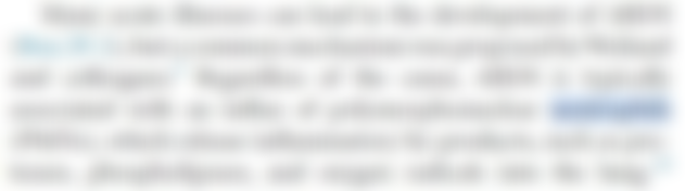 急性呼吸窘迫症候群之氣體交換與呼吸力學影響: ALI / ARDS 因肺泡微血管大量損傷,導致嚴重低血氧與侷限 性病理變化的現象。特別是微血管內皮細胞損傷、肺泡-微血管膜 之通透性增加,發炎物質浸潤、與液體充滿肺泡與組織間隙,造成 非心因性肺水腫,導致肺泡實質化與肺順應性降低。發炎物質的釋 放(游離基、細胞激素、活化補體系統),趨動嗜中性白血球,大 量聚集在肺部微血管,移行侵入肺間質與肺泡,造成肺泡上皮細胞 受損。破壞表面張力素,導致肺順應性更差,甚至造成肺塌陷,影 響肺部氣體交換與肺血管張力調控異常,導致通氣-灌流失衡,肺 內分流增加,造成嚴重低血氧和肺動脈高壓。