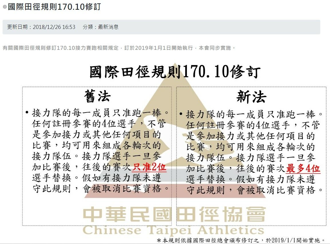 後續未見其他與「接力選手替換」相關規則之修訂,若有新資訊再煩請糾正與分享,謝謝。