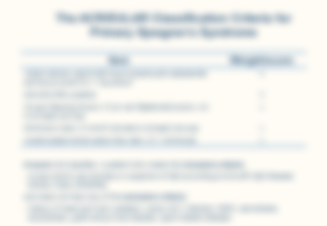 【已刪除】36.目前診斷Sjögren’s症候群,下列何種條件,可診斷原發性乾燥症(primary Sjögren’s syndrome)?①口乾 ②眼乾 ③Schirmer's test (+) ④唾液腺體切片異常(超過1 focus淋巴球聚集) ⑤唾液腺功能檢查異常 ⑥血中抗SSA或SSB抗體 陽性 ⑦關節疼痛