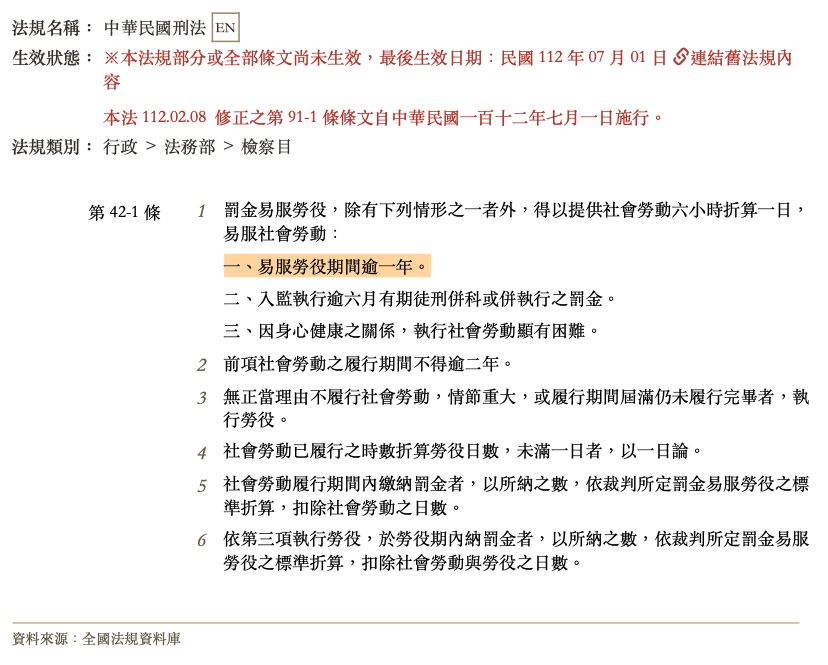 回樓上3F,第42之1條:罰金易服勞役,除有下列情形之一者外,得以提供社會勞動六小時折算一日,易服社會勞動: