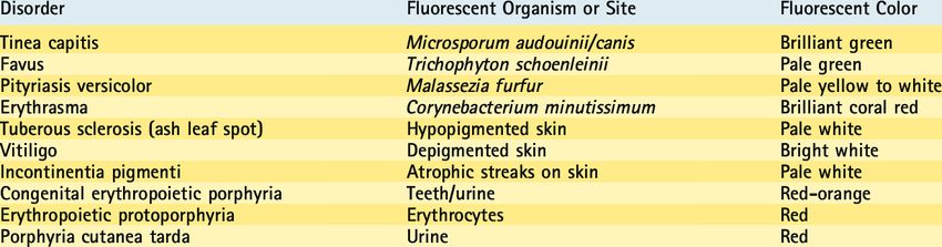 - 紅癬檢查 : 感染腋下, 胯下紅癬的患者患部用烏氏光檢查, 可看到珊瑚紅色的螢光。 http://www.mmh.org.tw/taitam/derma/service/id-wood.html