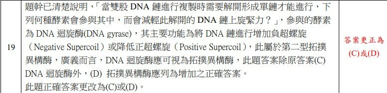 19. 當雙股 DNA 鏈進行複製時需要解開形成單鏈才能進行,下列何種酵素會參與其中,而 會減輕此解開的 DNA 鏈上旋緊力?