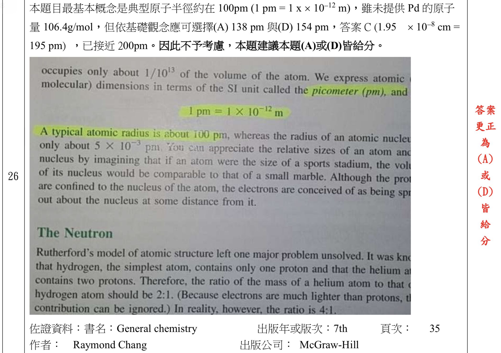 26. 鈀的結晶為面心立方晶體結構(face-centered cubic unit cell)。在 27℃下其密度為12.0g / cm3。 請計算 Pd 的原子半徑 (A) 138 pm (B)nm (C)cm (D) 154 pm (E) 0.109 nm