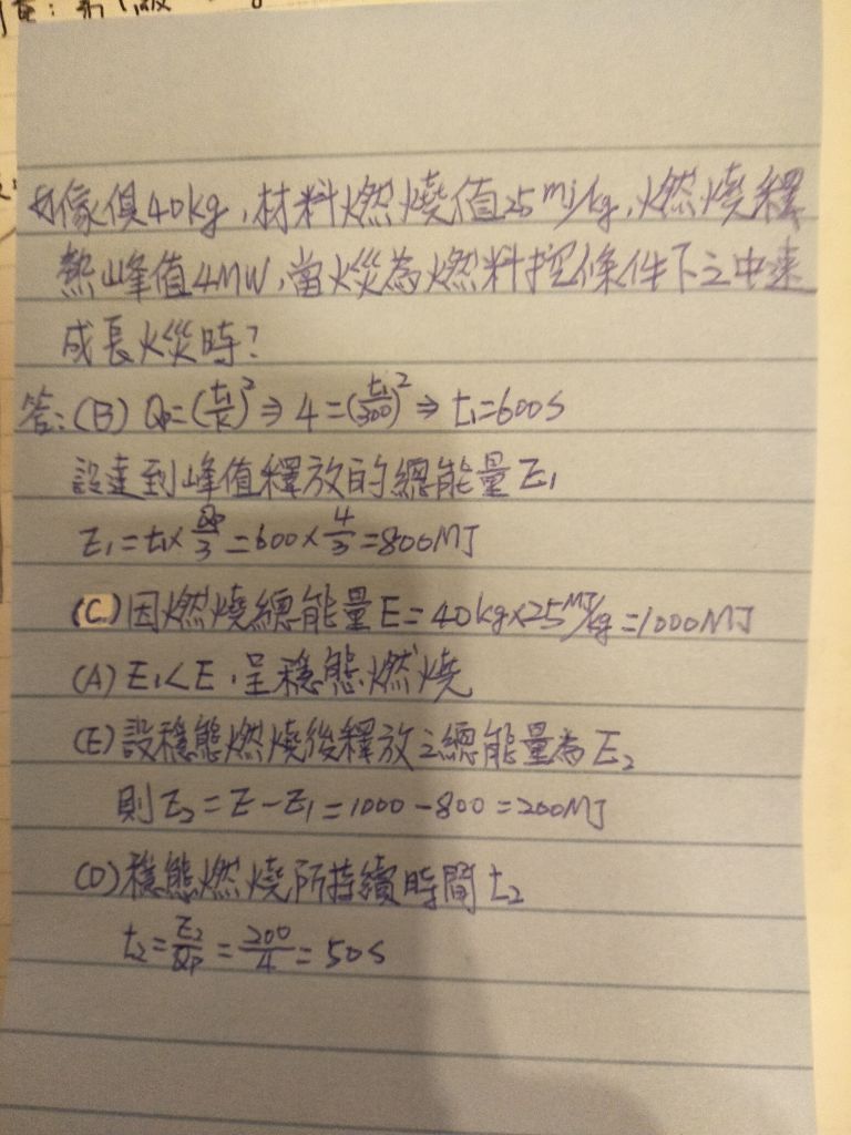 依題目: 某一居室內有傢俱 40 kg,其材料燃燒熱值為 25 MJ/kg,燃燒釋熱峰值為 4MW,當火災為燃 料控制燃燒條件下之中速成長火災時,下列何者正確?