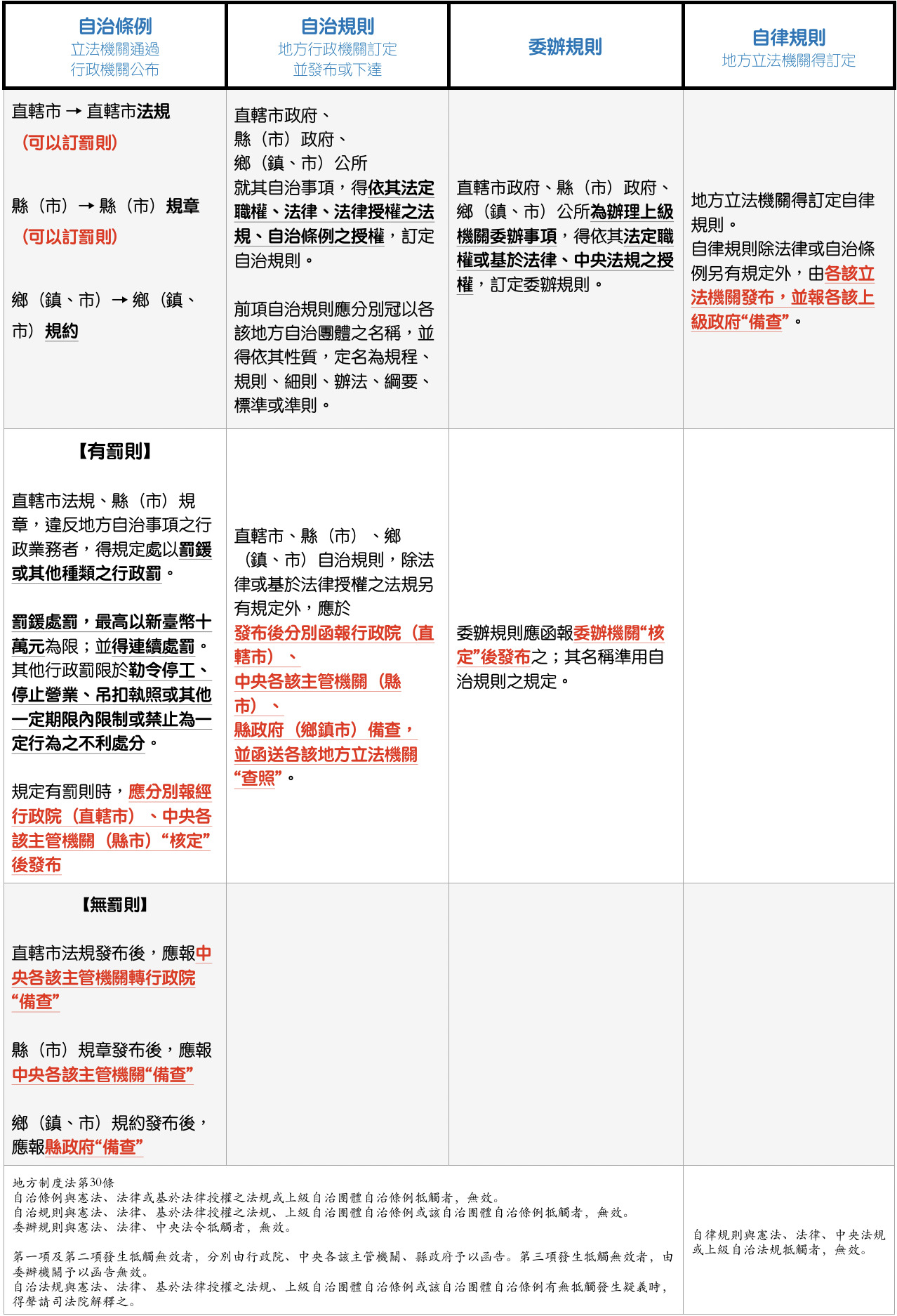 自治條例經各該地方立法機關議決後,如規定有罰則時,應分別報經行政院、中央各該主管機關核定後發布;其餘除法律或縣規章另有規定外,直轄市法規發布後,應報中央各該主管機關轉行政院備查;縣(市)規章發布後,應報中央各該主管機關備查;鄉(鎮、市)規約發布後,應報縣政府備查。