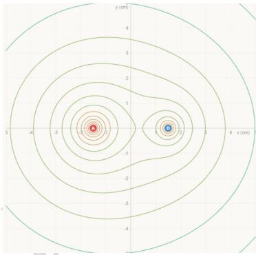 5.空間中有 A,B 兩個電荷,位置分別是在 A(-1.5cm,0);B(1.5cm,0)以下附圖畫出在 x 軸從(-5cm,0)到(+5cm,0);y 軸從(0,-5cm)到(0,+5cm)這個平面區域之內的等位線圖