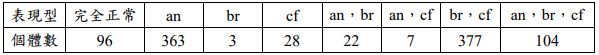 5. 造成玉米三種隱性突變性狀 an、br、cf 的相關等位基因 an、br、cf 位於同一條染色體上,而 an+、br+、cf+則分別為其相對應的正常等位基因。某研究員想研究此三基因的連鎖關係,他將二個玉米純品系(P1 和 P2 雜交),得到的 F1 子代對此三種性狀皆為正常型。再將 F1 植株與一個同時具有這三種隱性突變性狀的試交系雜交,結果得到的子代之表現型及其個體數如 下表。根據實驗結果,下列敘述哪些正確?
