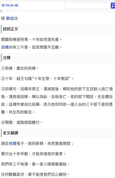 65.鄭成功〈復臺〉:「開闢荊榛逐荷夷,十年始克復先基。田橫尚有三千客,茹苦間關不忍離。」(註:田橫:秦 末狄縣人。本齊王田氏族。韓信破齊,橫自立為齊王,高祖登基後,橫率領從屬五百人逃至海島,高祖派人招降, 橫不願北面臣事之,遂自殺,餘五百人聞橫死,亦皆自殺。)關於此詩之解析,正確的選項是