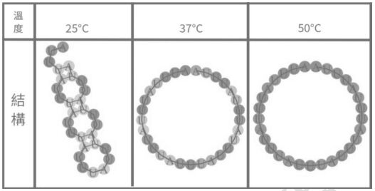 7. 附表為人類腫瘤壞死因子(TNF5mRNA 在 25°C、37°C、50°C 下的 結構預測圖。25°C為常溫下的溫度,37°C是模擬人體中的狀況,50°C則是大部分的RNA 會進行折疊調節或降解的高溫逆境。依照該表及分子生物學的理論,下列推論那些合理?
