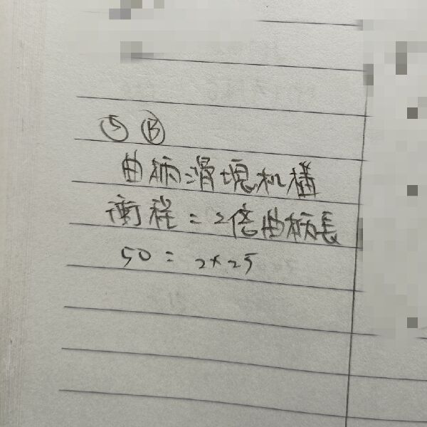 5 如圖所示,曲柄往復滑塊機構,滑塊之衝程為 50 cm,BC 桿之長度為 70 cm,求曲柄 AB 桿之長度為多少 cm?