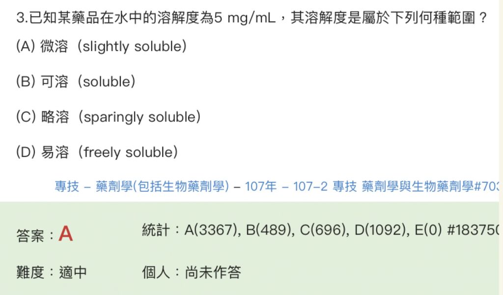5.依中華藥典,下列何者所表示之溶解度最低?