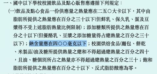以下);鈉含量應在四○○毫克以下;校園烘焙食品(麵包、餅乾