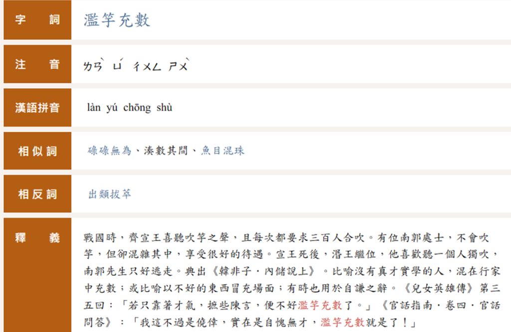 濫竽充數: 比喻無本領的冒充有本領,次貨冒充好貨。