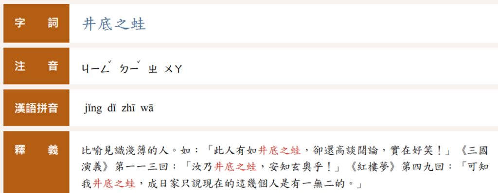 井底之蛙: 比喻見識狹窄的人。