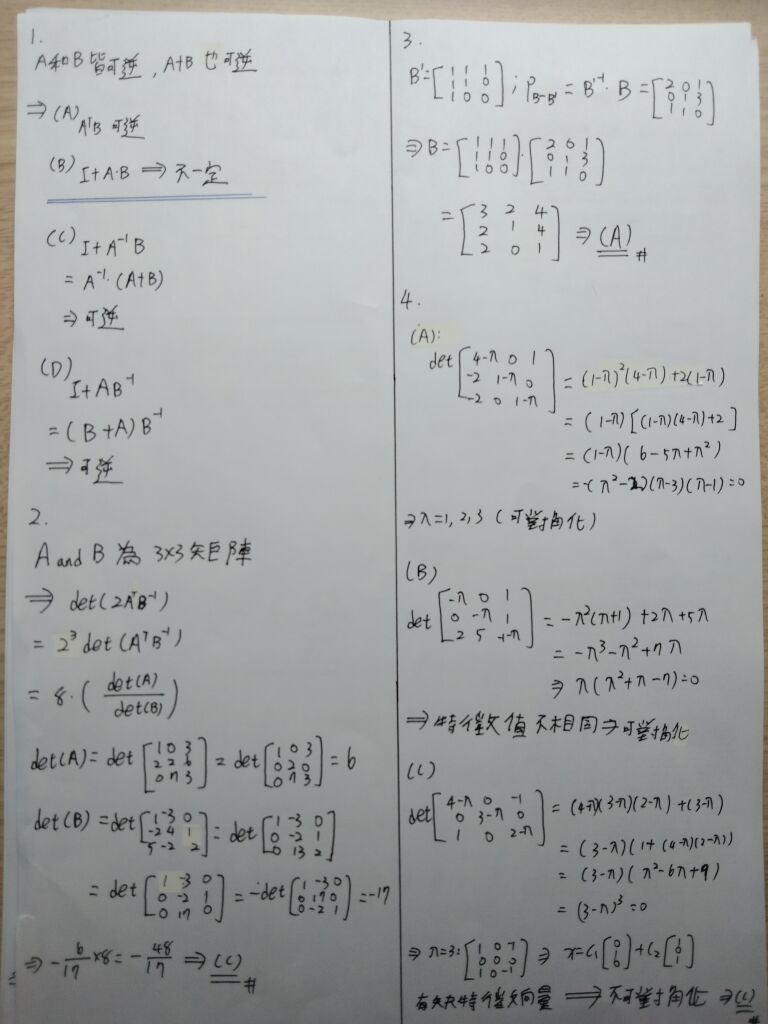 1 假設 A 與 B 為維度相同之方陣(square matrix)且 A, B, A + B 均為可逆(invertible)矩陣,則下列 何者不一定為可逆矩陣?