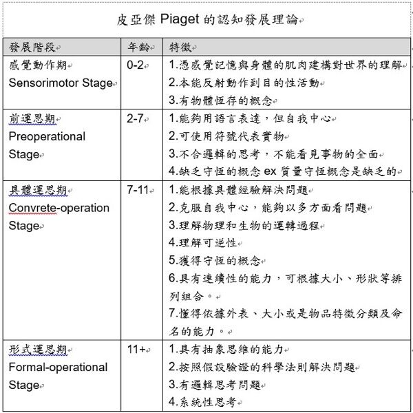 前運思期Preoperational Stage | 2~7歲 | 尚未能作出合乎邏輯的思考,只能使用簡單的符號。 | 1.能使用語言表達概念,但有自我中心傾向 |