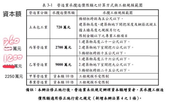 甲等綜合營造業為新臺幣二千二百五十萬元以上;