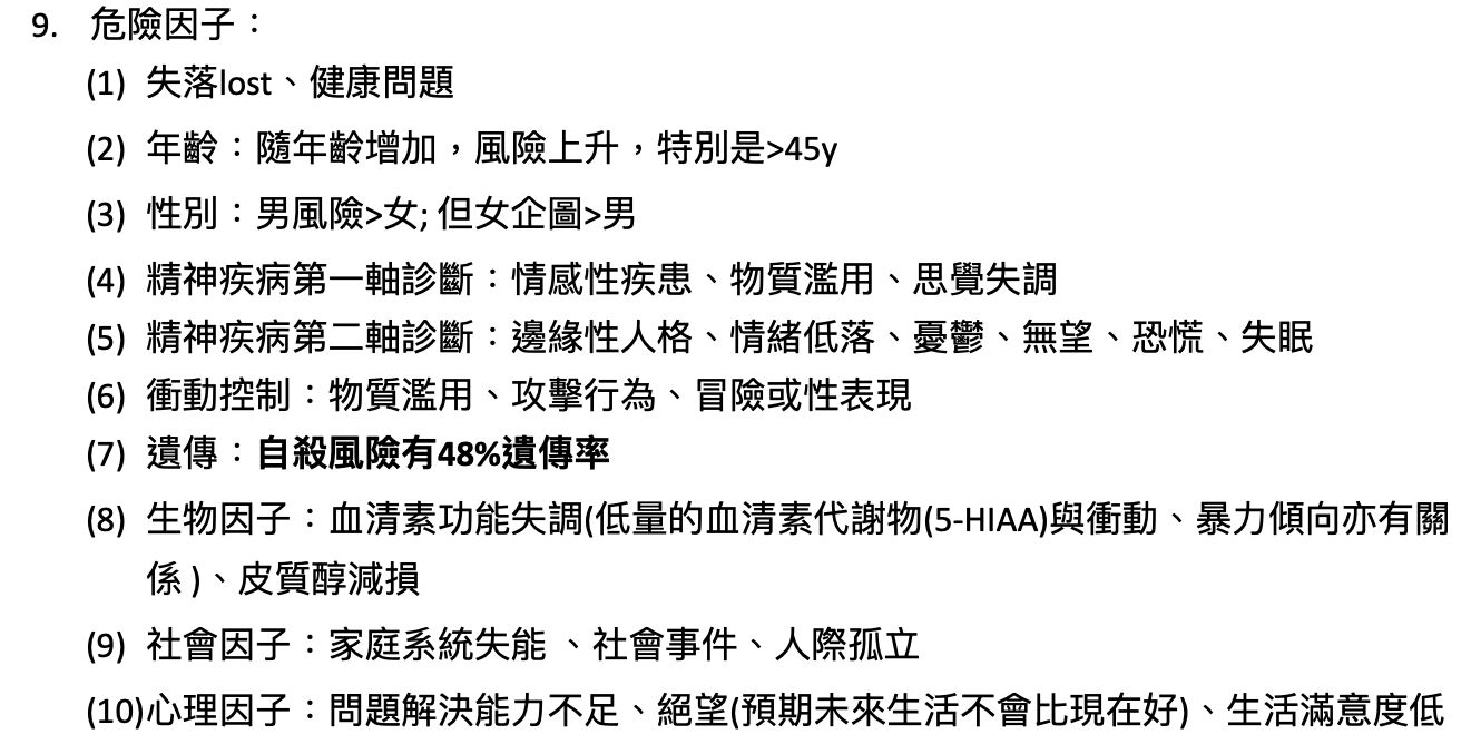 根據自殺防治這本書中提到,跟自殺有關的危險因子: