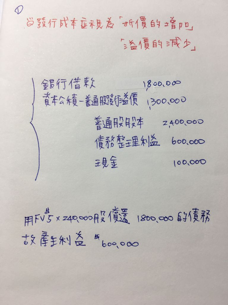 遂與乙銀行進行協商,乙銀行同意收取甲公司普通股股票 240,000 股(每股面額$10,公允 價值$5),以清償借款,甲公司另付股票發行成本$100,000。下列敘述何者正確?