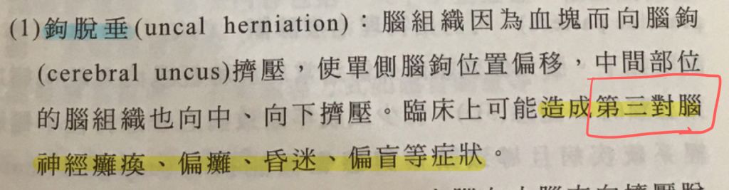 1.創傷性腦傷的同側偏盲,是那個腦葉血腫所造成的天幕切跡脫出(herniation through