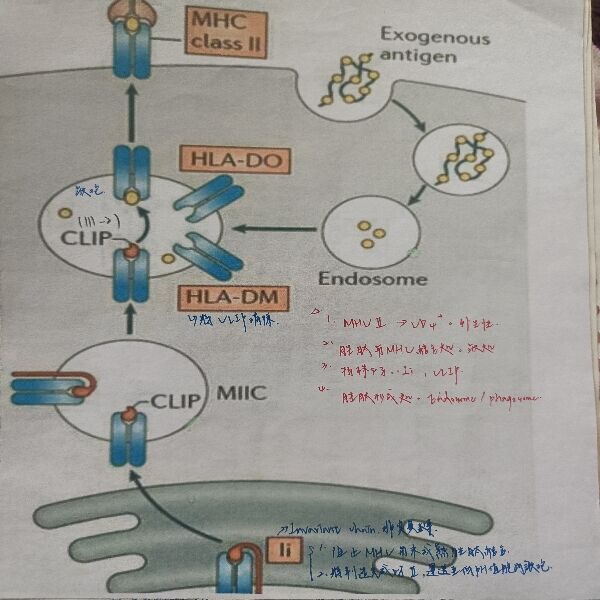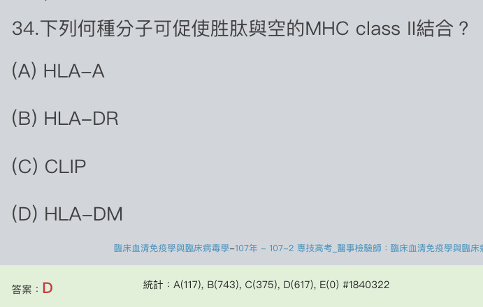 1.抗原呈獻細胞的胞內體(endosome)中,下列何種分子會先占據MHC class II的胜肽結合位,之後HLA-DM再媒介細胞外抗原與此分子交換結合位?