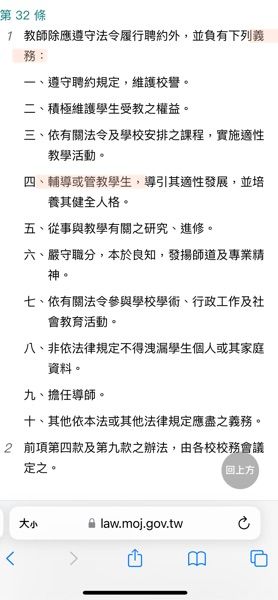 - 教師依法執行職務涉訟時,其服務學校應輔助其延聘律師為其辯護及提供法律上之協助。