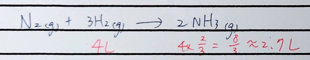 1. 依據下列化學反應方程式: 在標準狀態(STP)下加入氫氣 4.0 L,如果氫氣全部反應完,則會產生多少公升的氨氣? 氣體常數 R = 0.082 L・atm/K・mol(A)3.5L(B)2.7 L (C) 8.3 L (D) 1.4 L (E) 5.7 L