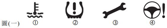 1. 圖(一)所示,有關車輛儀錶警示燈號之敘述, 甲:「①為引擎機油溫度警示燈,②為胎壓偵測系統警示燈」; 乙:「③為維修保養提醒燈,④為液壓動力輔助轉向系統警示燈」,下列何者正確?