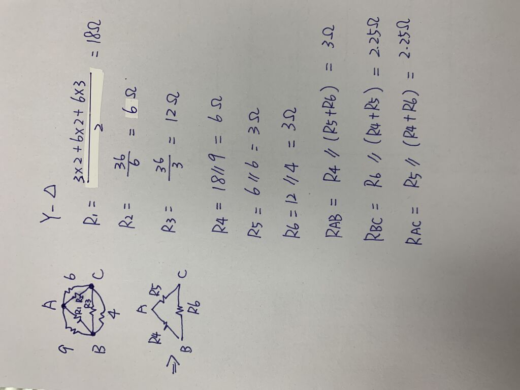 1. 小明老師教到基本電學第三章串並聯電路,上課時在黑板上畫了一道題目如下圖, 小明老師請學生計算AB端電阻、BC端電阻、CA端電阻,請同學 自告奮用上台計算,以下計算結果何者正確? (A)安安計算 (B)勒勒計算 (C)華華計算(D)以上皆錯