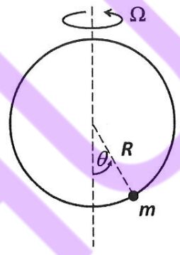 1. A bead of mass m is constrained to move on a massless circular hoop of radius R. The hoop is rotating around its center that is aligned in the z-axis (the direction of gravity g) with a constant angular velocity Ω, see figure below. If the hoop is rotating slowly, this system has a stable equilibrium angular velocity of the hoop exceeds a critical 0 becomes unstable. What is the critical angular velocity?