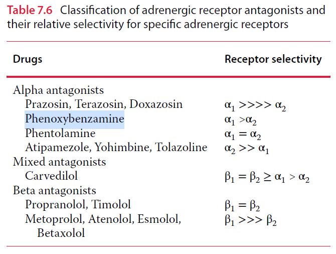 Phenoxybenzamine:治療嗜鉻細胞瘤、治療高血壓(易有姿勢性低血壓)、共價結合