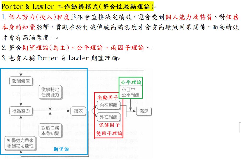 10 波特(Porter)和勞勒(Lawler)兼納各家之說發展出動機作用模式,請問下列那種理論並不包括在內?