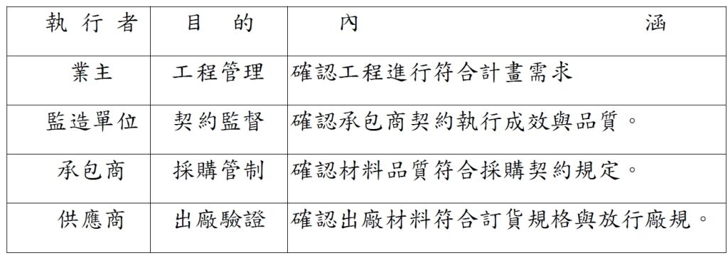 10. 採購產品品質之驗證,業主、監造單位、承包商與供應商都應對材料品質實施抽驗,承包商執行之目的為: