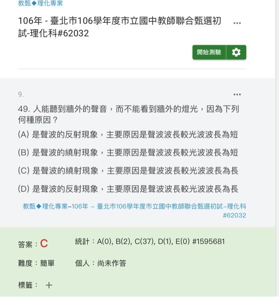 (B) 聲波的能量遠大於光波,所以會有部分穿透牆壁