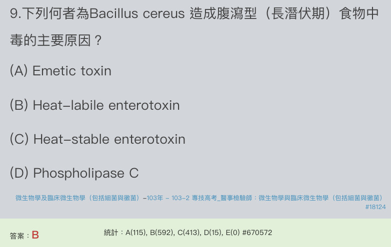10.有關Bacillus cereus嘔吐型食物中毒的敘述,下列何者錯誤?