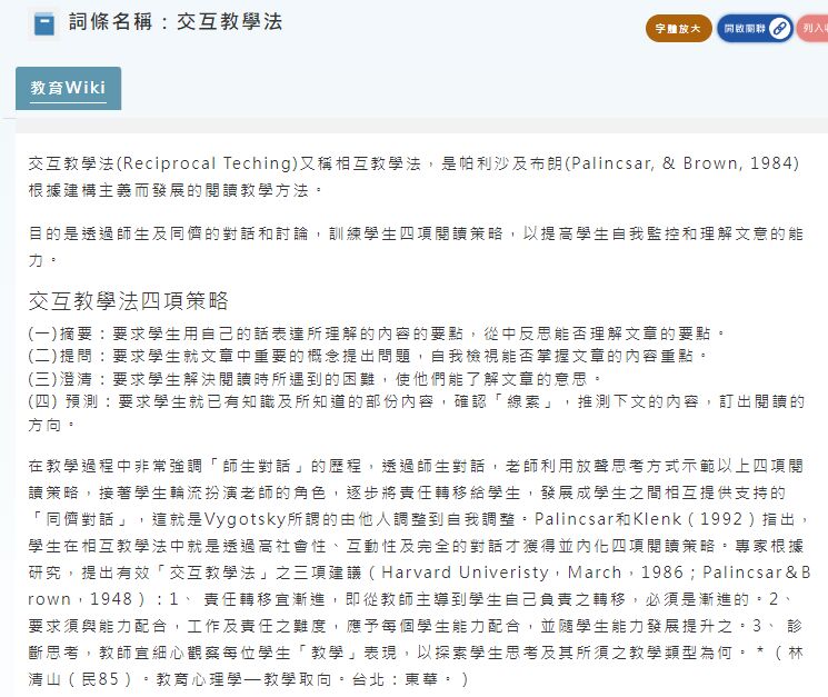 交互教學法(Reciprocal Teaching)又稱相互教學法,是帕利沙及布朗(Palincsar, & Brown, 1984)根據建構主義而發展的閱讀教學方法。
