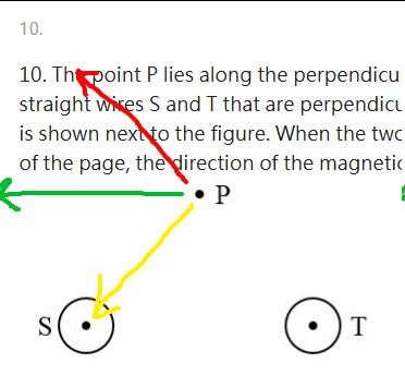則S在P點產生紅色箭頭磁場, T在P點產生黃色箭頭磁場, 磁場合為綠色方向 A (A)