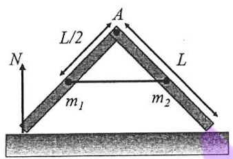 10. Two uniform ladders, both of length L, are hinged at point A and tied together by a horizontal rope at its center. The angle between the ladders is 90 degree. The ladders have mass m₁ and m₂ respectively. Assume the floor is frictionless. Find the tension in the rope.