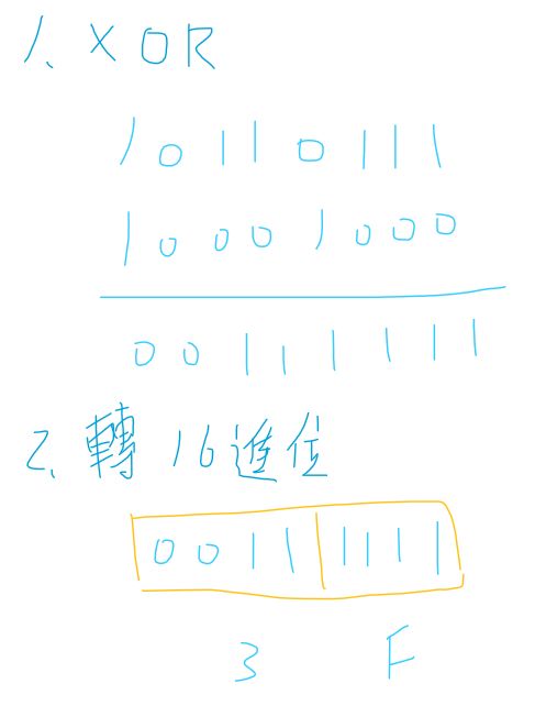 1016. 二進位的10110111和10001000之值做XOR運算後,其以16進位表示為: