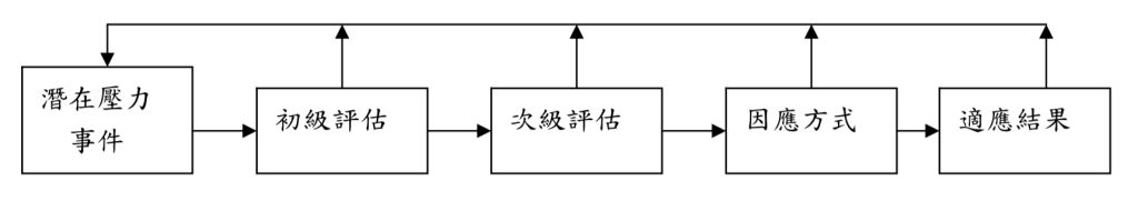 Lazarus 和 Folkman(1966,1984)認為壓力是刺激和反應的互動歷程,以個體認知評估為刺激—反應的中介變項,共有三歷程,如圖所示: