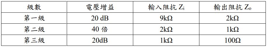 11. 一個三級串接放大器電路,已知輸入訊號源 Vs = 2mV,內阻 Rs = 1kΩ,負載電阻 RL = 100Ω。各級參數如下。試問輸出電壓Vo為何?