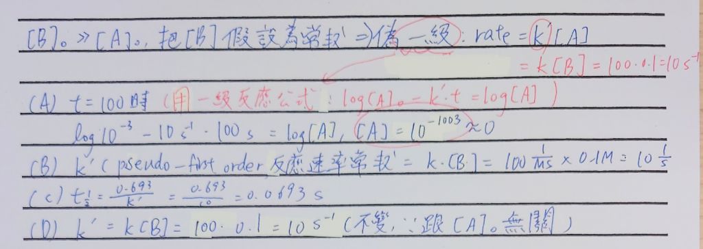 (B) 偽一級(pseudo-first order)反應速率常數 kobs = 0.1 s-1