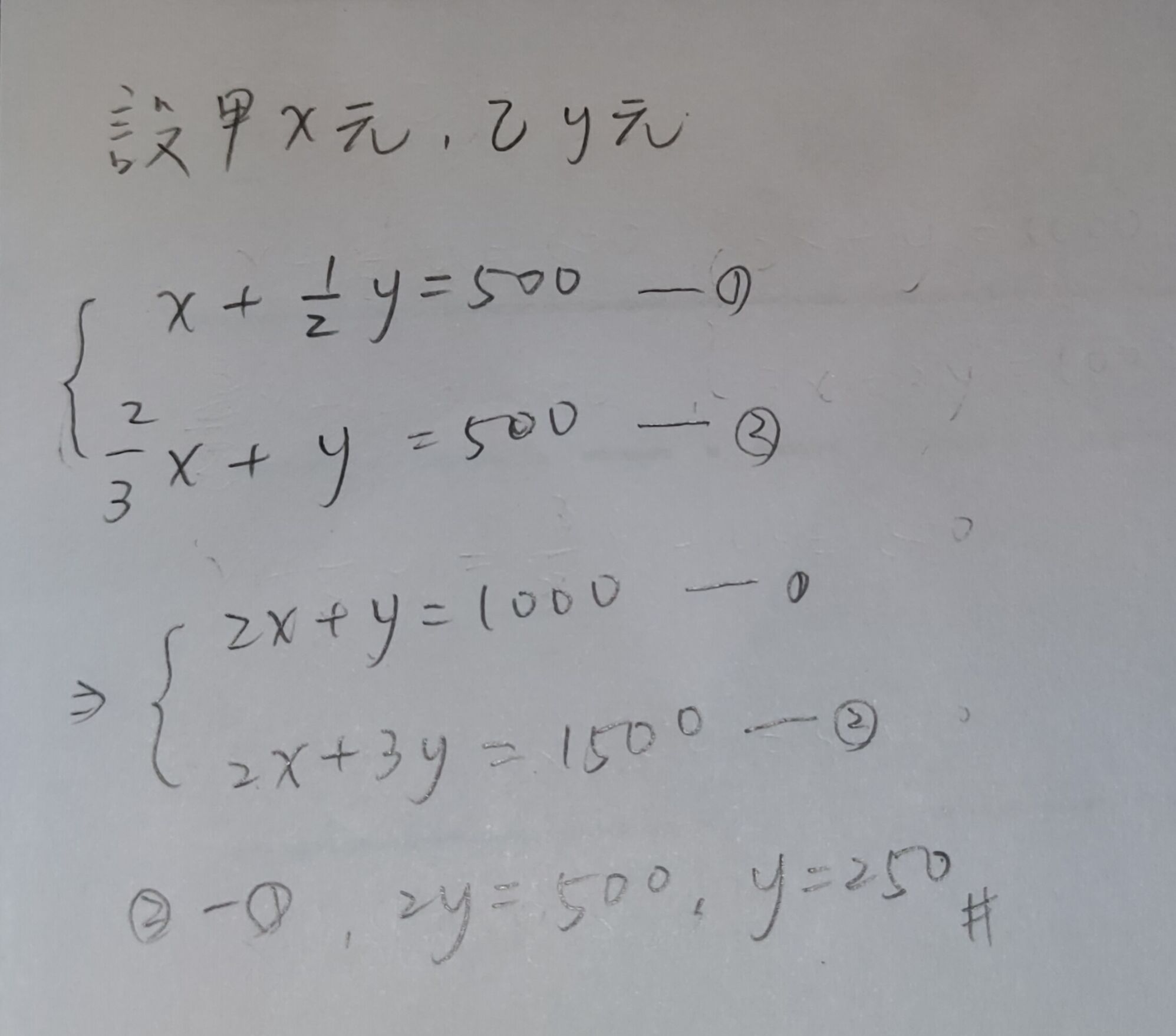 11. 甲、乙二人身上都有新台幣若干元。如果乙把身上一半的錢給甲,甲就 有 500 元。如果甲把身上三分之二的錢給乙,乙也會有 500 元。請問 乙有多少錢?