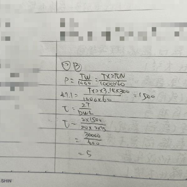 12 一直徑 20 cm 之軸,以帶輪傳動,帶輪上用一 2×2×15 cm 長之方鍵連結於軸上,當轉速 300 rpm 時,若傳